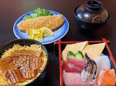 昼食付:富津ひろ鮨にて、海鮮と穴子の2種丼、アジフライ付です
